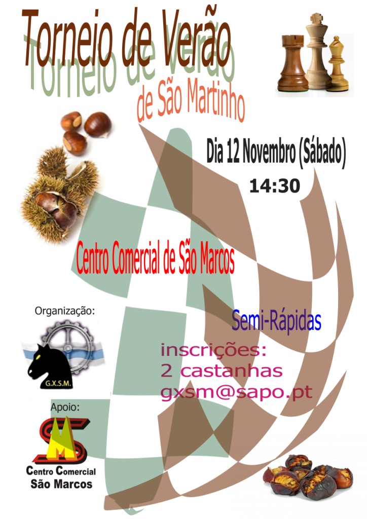 No próximo dia 12-11-2011 irá realizar-se o Torneio de São Martinho organizado pelo GXSM, este torneio, irá decorrer no Centro Comercial São Marcos pelas 14:30 (ver documentos anexos) e fará parte do circuito de semi rápidas da associação de xadrez de Lisboa.